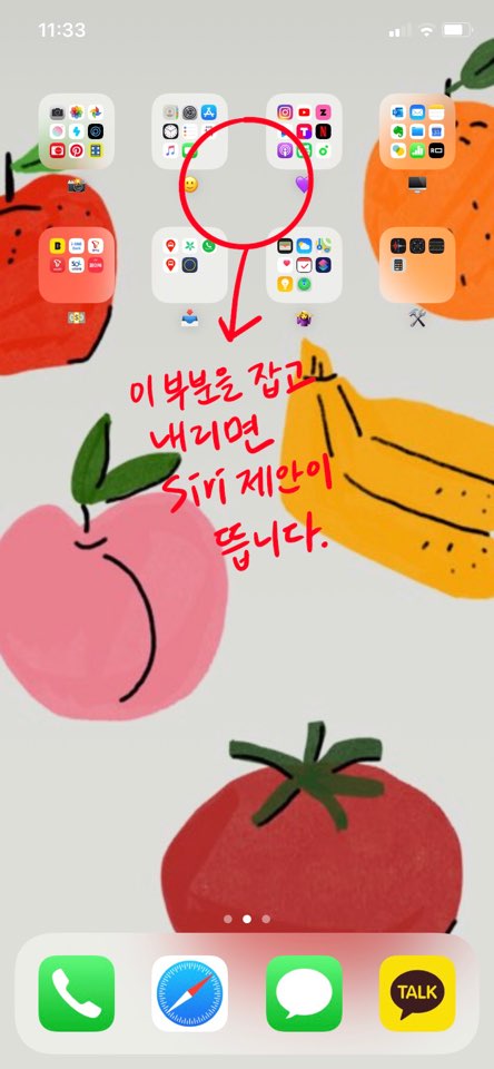 위 사진 처럼 상단부분(상단바 X) 을 잡고 아래로 끌어 내리시면 [SIRI 제안] 을 볼 수가 있습니다.